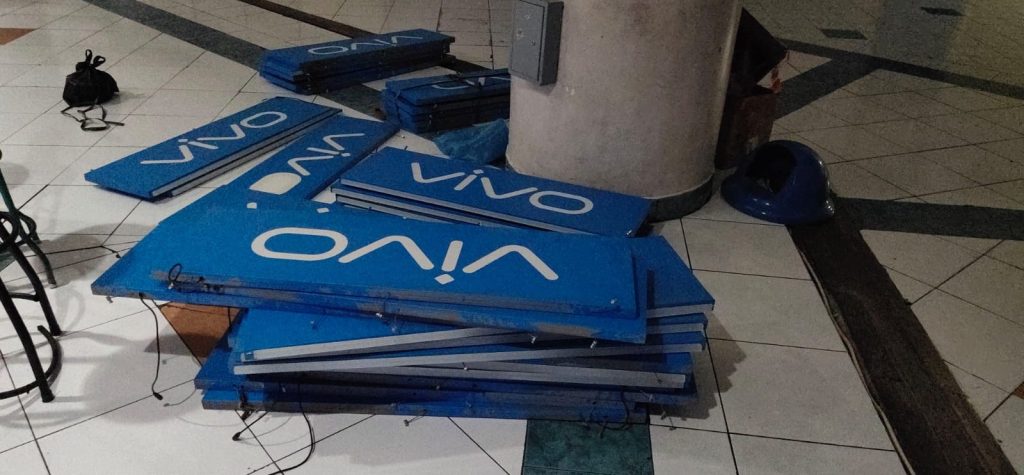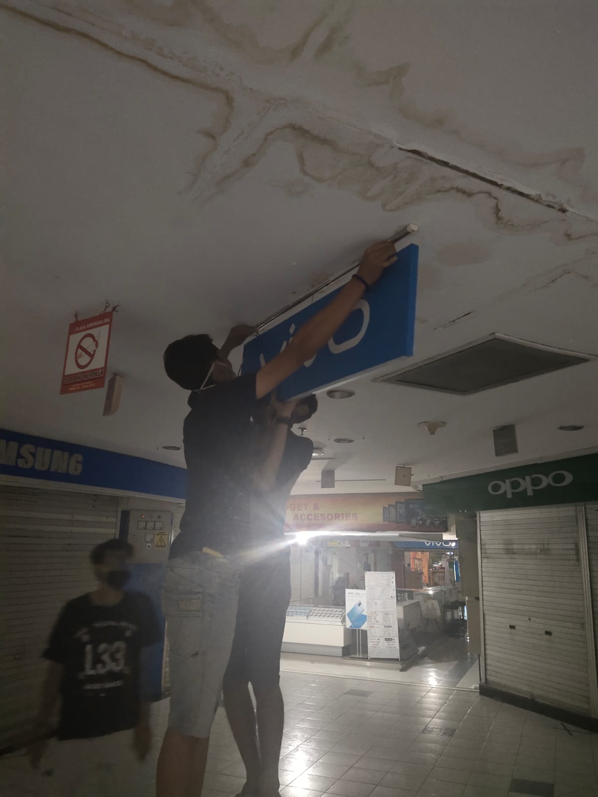 Ringkasan Pekerjaan: Pengerjaan ini meliputi proses pelepasan unit signage gantung (hanging lamp) merek Vivo yang berlokasi di area koridor utama Plasa Simpang Lima, Semarang. Tim bertanggung jawab penuh mulai dari pemutusan jalur kelistrikan yang aman hingga penurunan unit dari plafon bangunan.